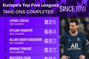 17-18赛季以来五大联赛成功过人榜:梅西826次居首,姆巴佩次席