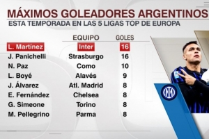 本赛季五大联赛阿根廷球员射手榜:劳塔罗、帕尼切利16球居首
